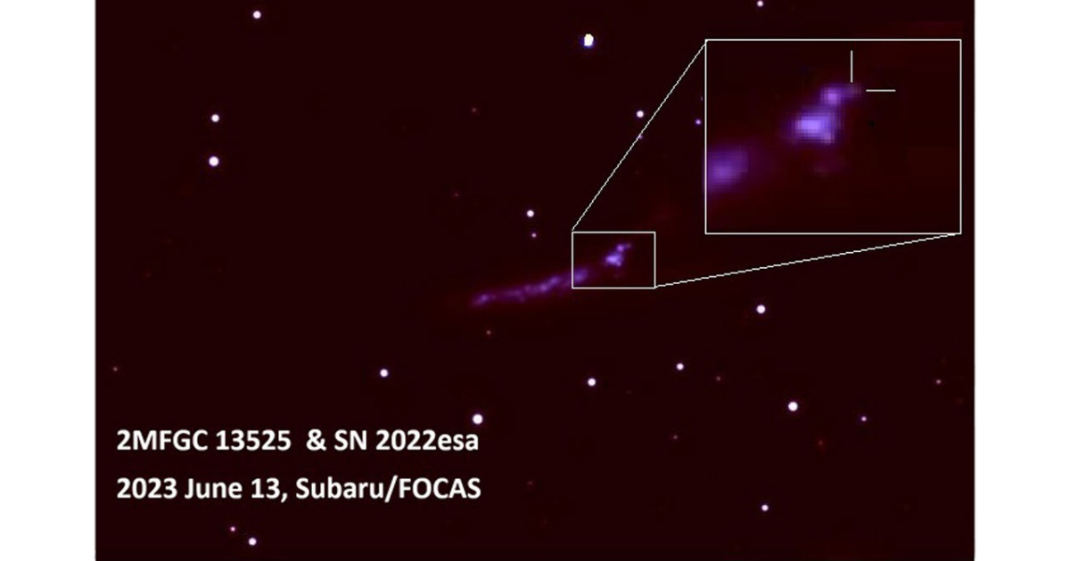 The image of the supernova SN 2022esa (marked by the cross) with its host galaxy, 2MFGC 13525, taken by the Subaru telescope on 2023 June 13. At this late phase (about a year after the discovery), the SN became fainter than its initial brightness by more than a factor of 100. The spectral identity of SNe Ic-CSM can be extracted only in such a late phase in most cases, requiring dedicated observations with 8 meter-class telescope such as the Subaru telescope. (KyotoU / Keiichi Maeda)