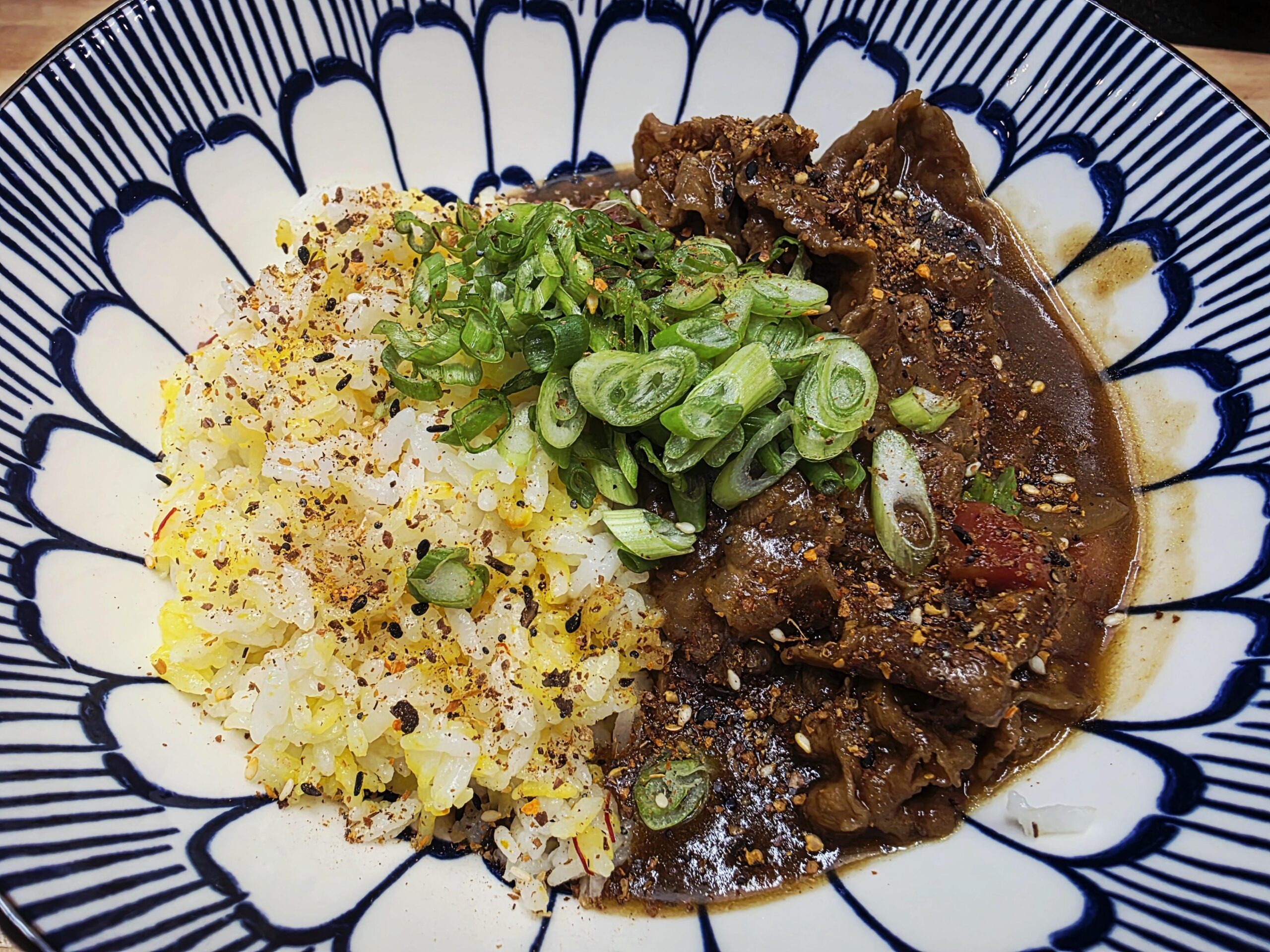 Had some Iwate wagyu chuck roll and plate that needed to get used so I whipped up a nice little curry. I know saffron in the rice is very non traditional, but I wanted to mix things up a bit. I really like the visual effect of it.