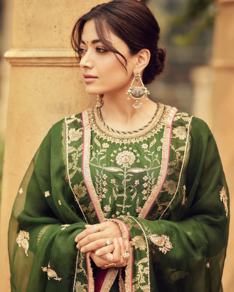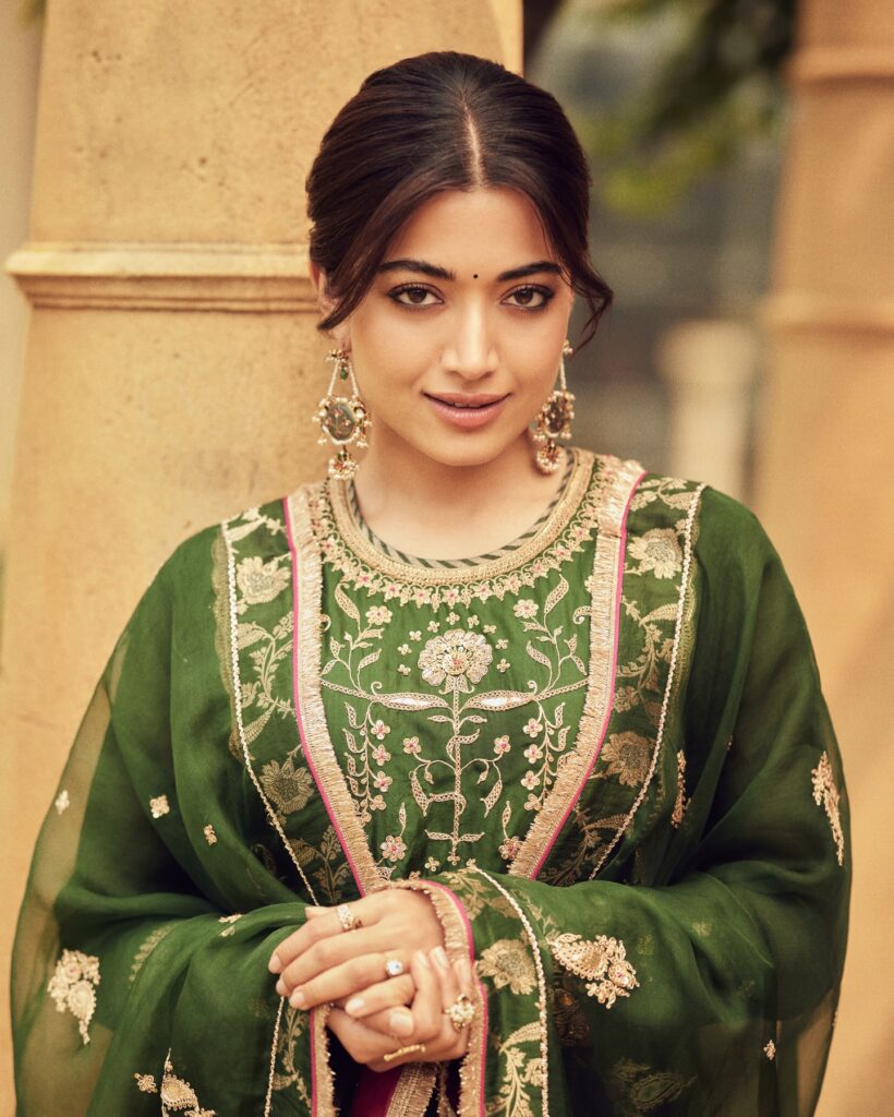 In recent photos, she slipped right into Sankranti mode. Rashmika shared new pictures in a fresh green outfit, and they instantly clicked online. The colour worked beautifully on her, and the styling stayed simple. There was a softness to the pictures, calm, festive, and very her. Sometimes that understated vibe ends up making the strongest impression, and this was one of those moments.