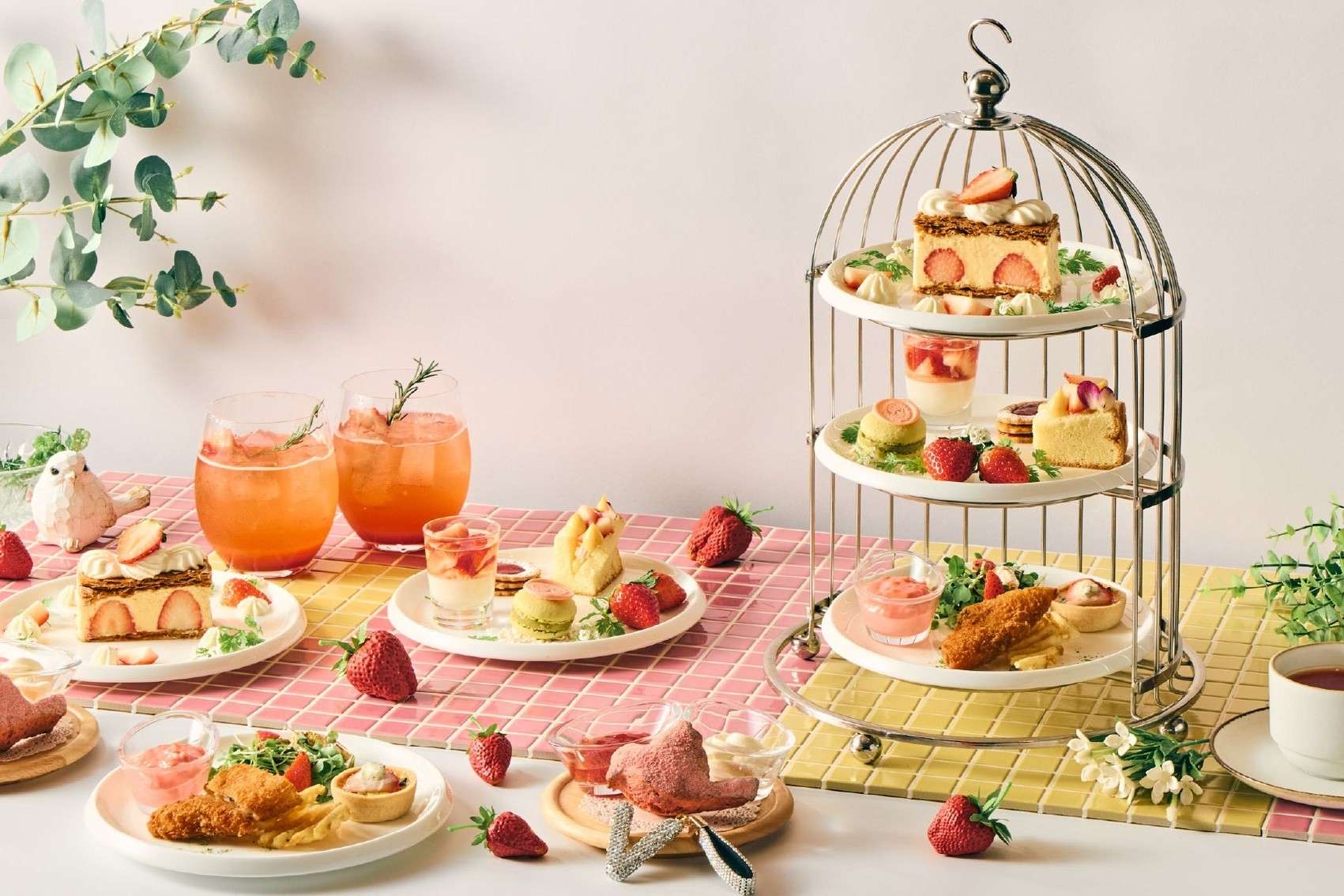 The theme is 1980s tea time in Japan, with strawberry-focused sweets and savory items presented on a three-tier birdcage stand. The period will be divided into two parts: “London Tea Time” until March 15, and “Easter Tea Time” from March 16 onward. For each period, in addition to a main strawberry sweet, mini sweets, and savory items, a common menu of a little-bird-shaped strawberry scone plate and a strawberry-based mocktail will be offered.