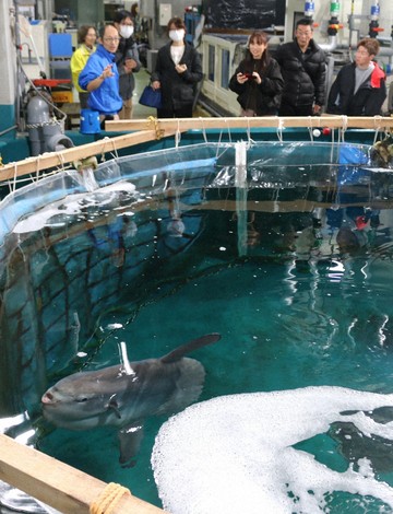 A sunfish in a backstage tank is seen at Kaikyokan aquarium in Shimonoseki, Yamaguchi Prefecture, Dec. 12, 2025. This can only be seen during the “guided tour for maniacs.” (Mainichi/Yasuhisa Yamamoto)