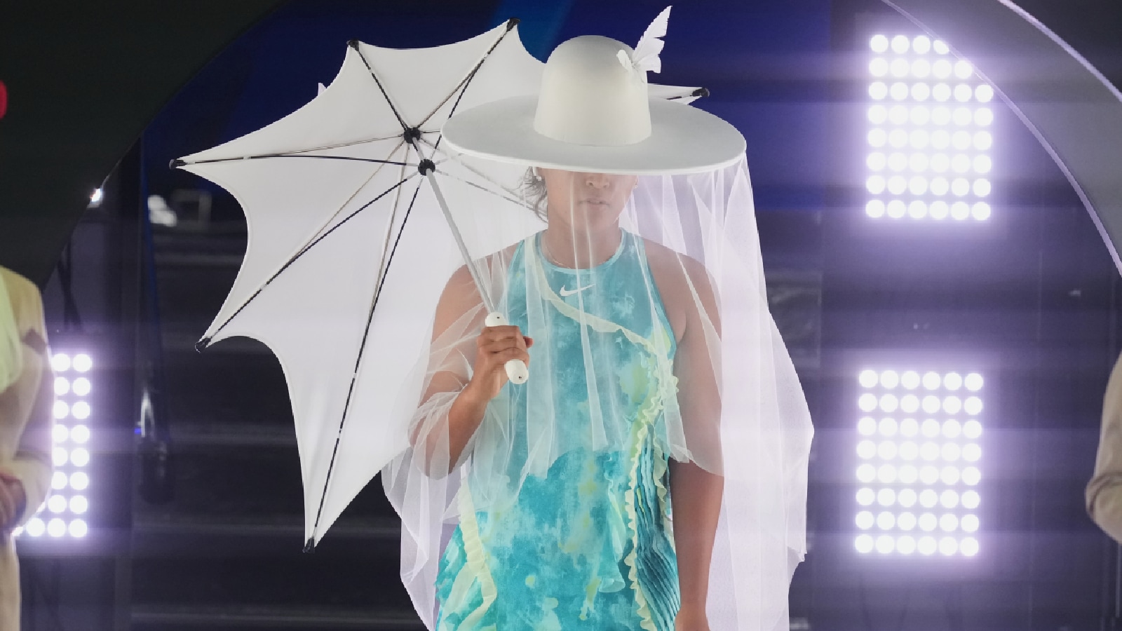 Naomi Osaka made possibly one of the greatest entrances ever made by a tennis player when she walked out onto the main court at Melbourne Park for the last match of the day while sporting a white umbrella, a white-brim hat and draped in a white veil.