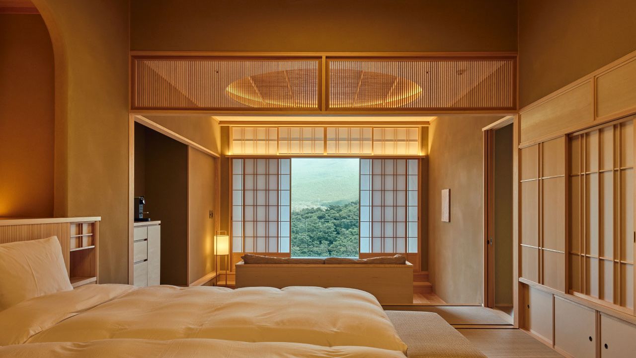 Many hotels claim to create a sense of place for guests, but Gora Kadan Fuji’s 39 suites and three standalone villas really deliver. Every accommodation offers an introduction to Japanese ryokan culture before you even step inside, with each having a kutsunugi ishii, a shoe-removing stone, at their entrance. It’s here where outdoor footwear is removed, symbolizing the transition between the outside world and the inner sanctuary of the suites. Materials like tatami mats, cedar wood, bamboo, paper and granite combine to form a harmonious minimalist aesthetic that simultaneously feels traditional and modern. Delicate details are everywhere, from the finger-holds shaped like cranes and gourds to open sliding doors, to the lacquered boxes containing calligraphy kits with ink and brushes.