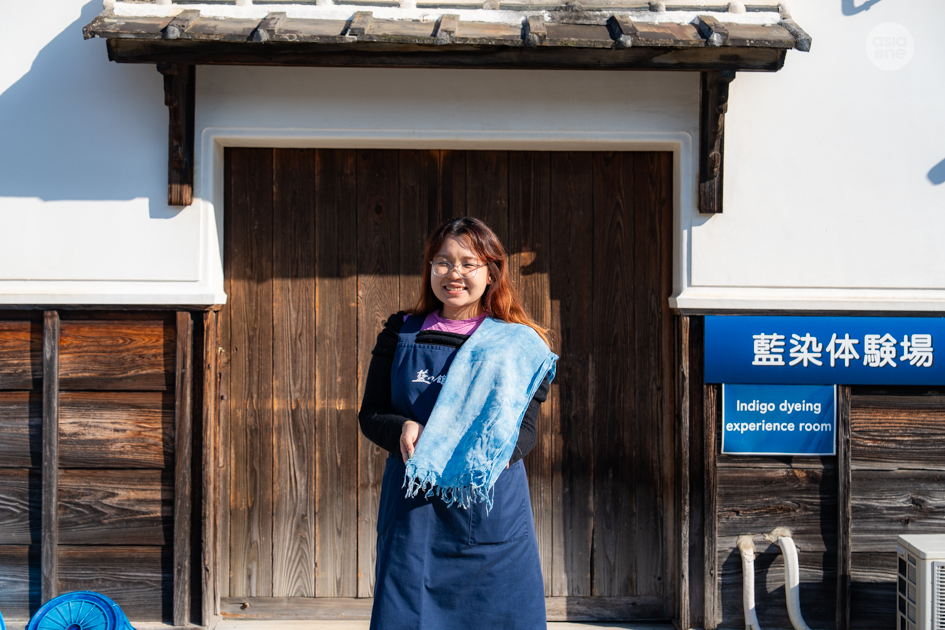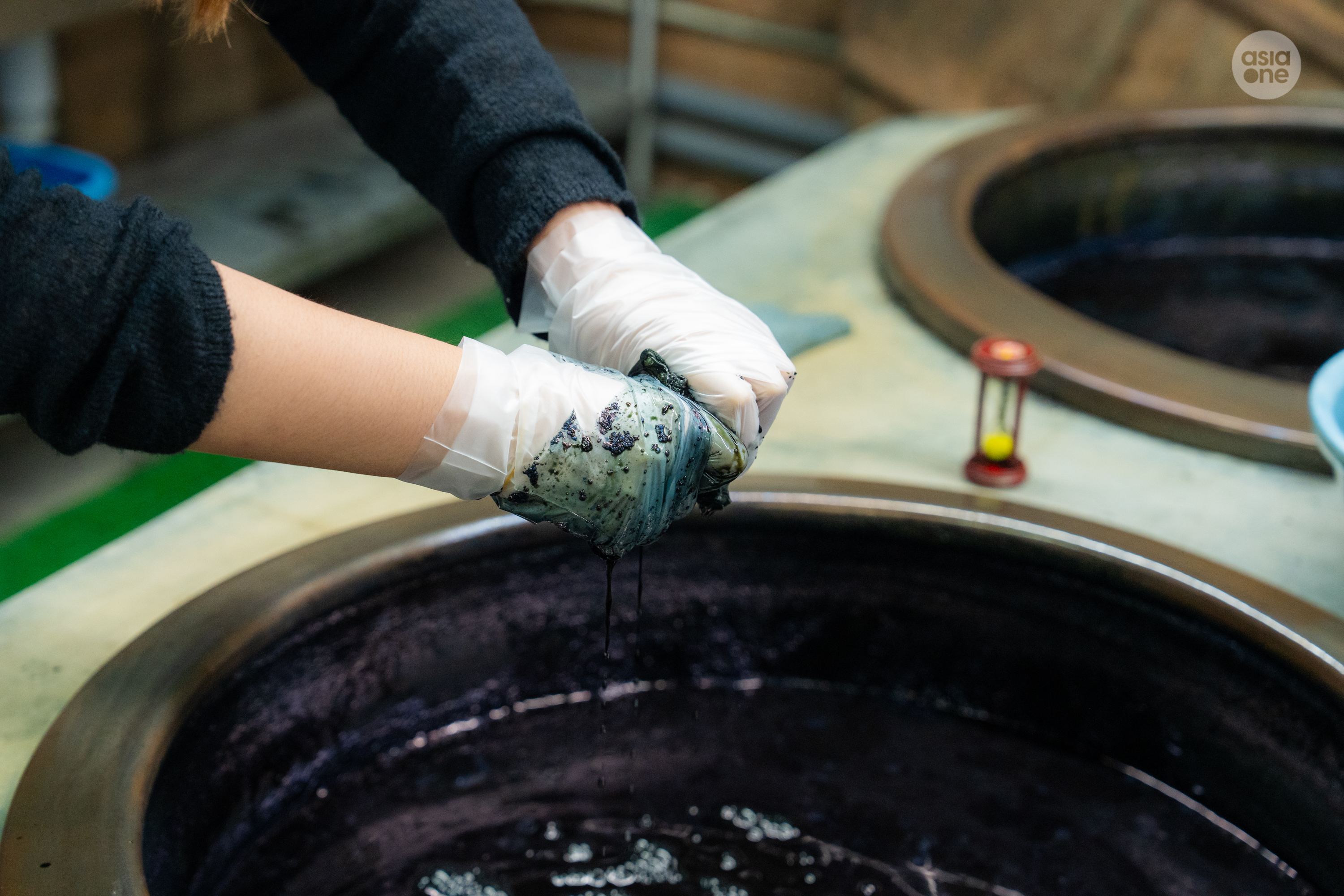 The activity takes just under 20 minutes, and I emerged with my one-of-a-kind cotton scarf dyed in indigo blue using a Murakumozome technique, which deliberately forms uneven colours and shapes.