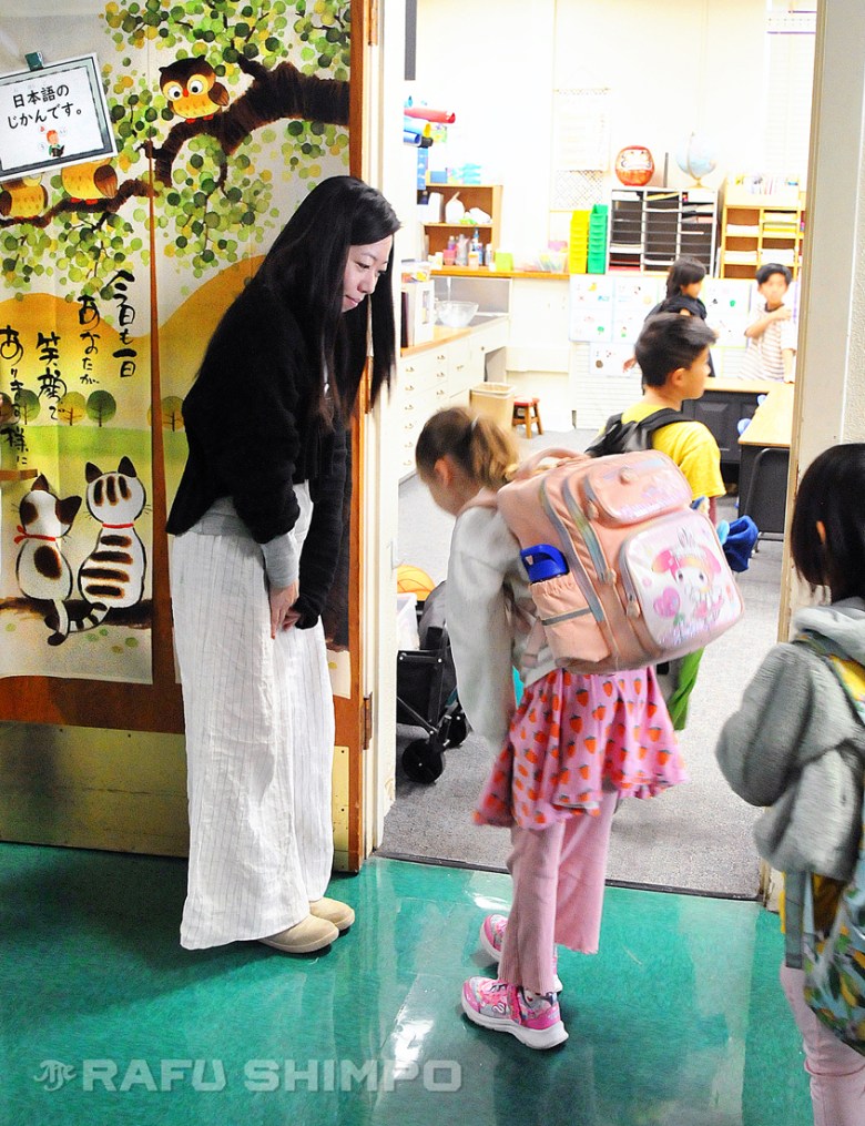 Customs as well as language are learned in the Verdugo Woodland Japanese Immersion program. Teacher Ayumi Ingram welcomes her students as they bow before entering the classroom. A sign on the door reminds students, “It’s time for Japanese.” (MIKEY HIRANO CULROSS / Rafu Shimpo)