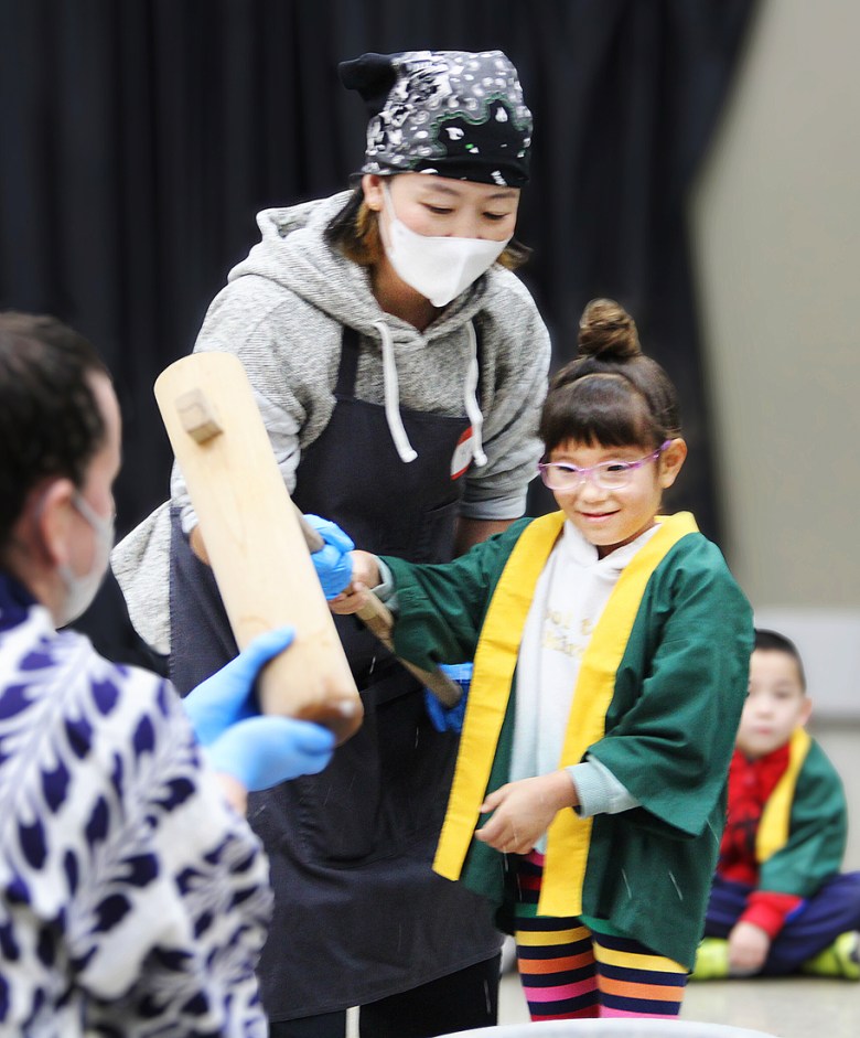 Kindergartener Luna Yui Amador tries her hand at the kine (mallet) during a mochitsuki at Verdugo Woodlands on Jan. 16. In addition to language immersion, the students take part in Japanese cultural and holiday activities throughout the school year. Courtesy Verdugo Woodlands Elementary