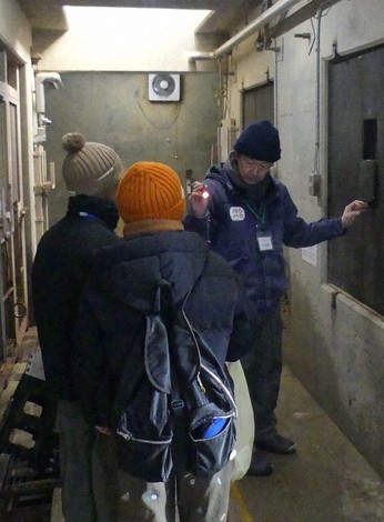 Five groups consisting of nine participants, including elementary school students in the city and visitors from Hokkaido, attended on Jan. 10, the first day of the tour this year. The guests peered through small windows to observe two black bears that entered hibernation in December 2025, sleeping huddled in a corner while a zookeeper provided explanations.