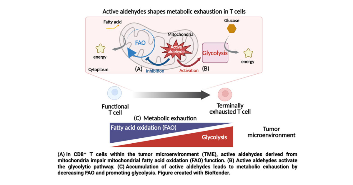 “This effect is mediated by active aldehydes which disrupt the balance between glycolysis and FAO, leading to terminal exhaustion,” adds co-first author Yasuharu Haku.
