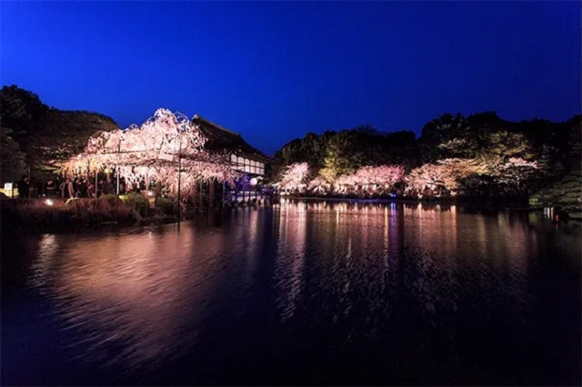 Well, the sky will be dark. Heian Shrine itself won’t be though, because at the beginning of April it’ll be holding its annual Sakura Otoyo light-up event. Sakura, as you probably already know, is the Japanese word for cherry blossoms, which should be in bloom at this time, and so for five nights, from April 1 to 5, the shrine will be open later than normal and the Otenmon gate, Daigokuden hall, and Minami and Higashi Shinen (south and east gardens) will be lit up to provide an even greater contrast between the soft pink of the sakura’s petals and the night sky.