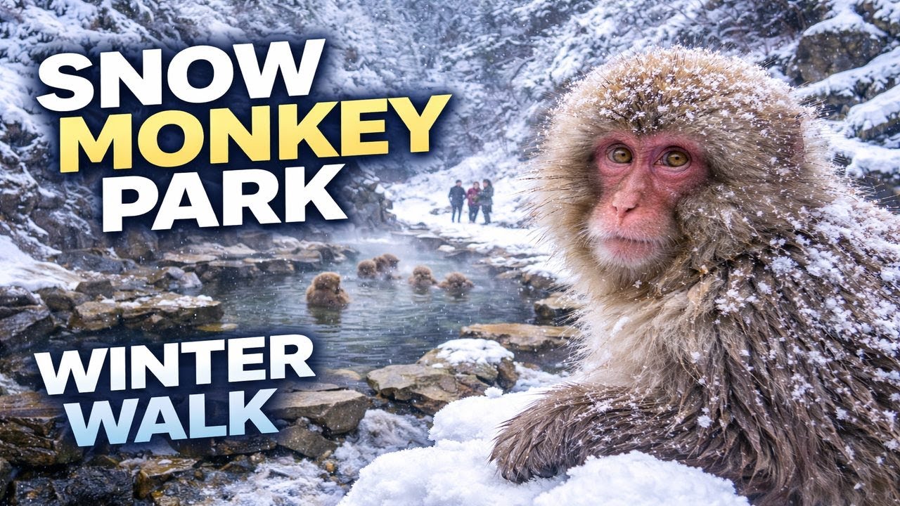 This is a real-time walking video filmed in winter, featuring the famous Japanese snow monkeys enjoying the natural hot springs.
