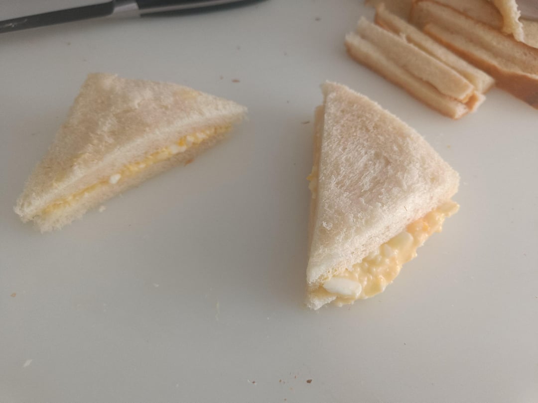 Maybe I'm wrong but I don't think I need to put a recipe for this since it's just mayo and boiled eggs mixed and put into the sandwich without the crust (I didn't waste anything though, I just ate them separately).