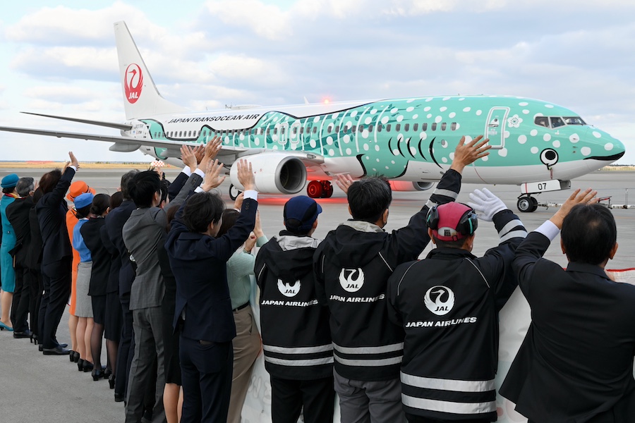 Cabin crew members wearing successive generations of uniforms, from the first uniform adopted in 1967 by JTA’s predecessor Southwest Air Lines to the current seventh-generation uniform, took part in the ceremony, welcoming passengers on the inaugural flight and handing out commemorative gifts. The inaugural flight was operated by the third “Jinbei Jet,” introduced on January 19, named “Yui Jinbei” (aircraft registration: JA07RK), featuring a whale shark livery, and all 165 seats were filled. The aircraft pushed back from spot number 41 at 8:10 a.m. and took off from Runway A at 8:23 a.m. According to JTA, the return flight NU302 departing from Taipei is also expected to be fully booked.