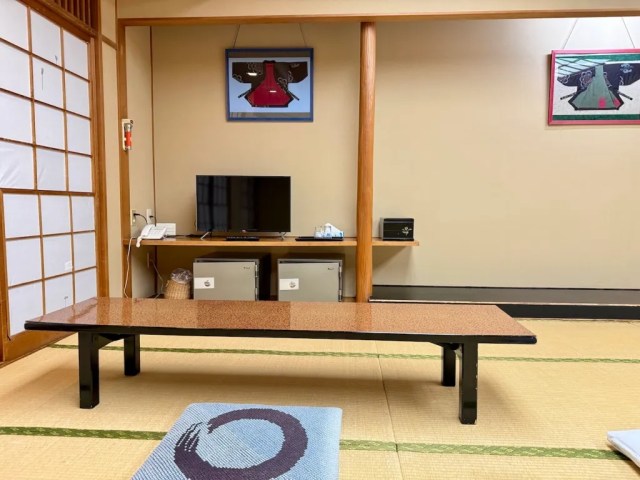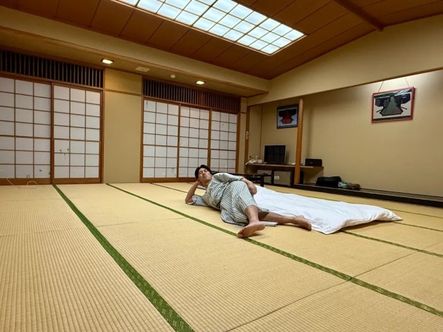 But why does the hotel have such a huge room? Well, it’s primarily meant to be used by large groups, such as students on school trips or athletes on training retreats. There’s no attached shower, since the hotel has a communal Japanese-style bath for guests to use, so space-wise you could easily have 10 people staying together in this one room. However, on days when all of the hotel’s smaller rooms are already booked, and they have no large groups coming in, even solo travelers have a chance to book the Sadamine, and having so much personal space can make you feel like royalty, especially if you strike a pose like our Japansese-language reporter Masanuki Sunakoma is here.