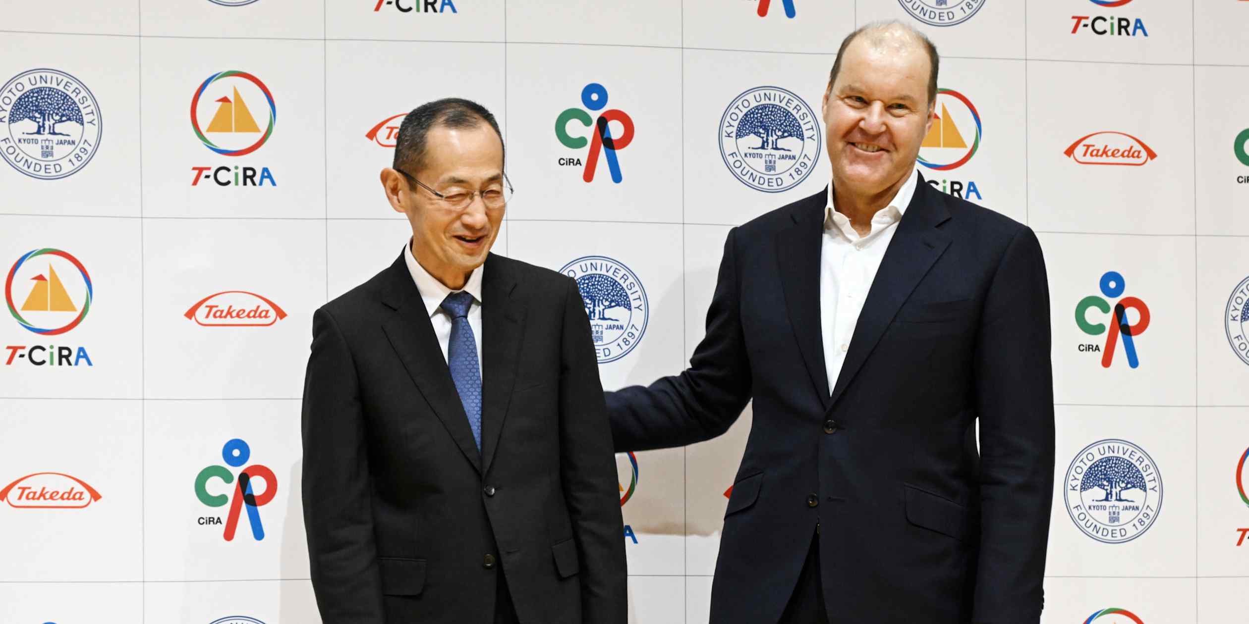 Kyoto University professor Shinya Yamanaka, left, and Takeda Pharmaceutical President Christophe Weber after their news conference in Tokyo on Feb. 3. (Photo by Nanami Sato)