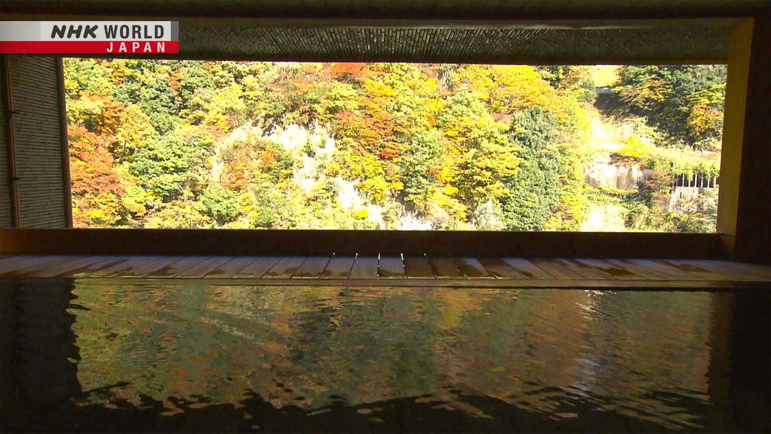 A well-established inn has a hot spring overlooking the stunning fall colors.
