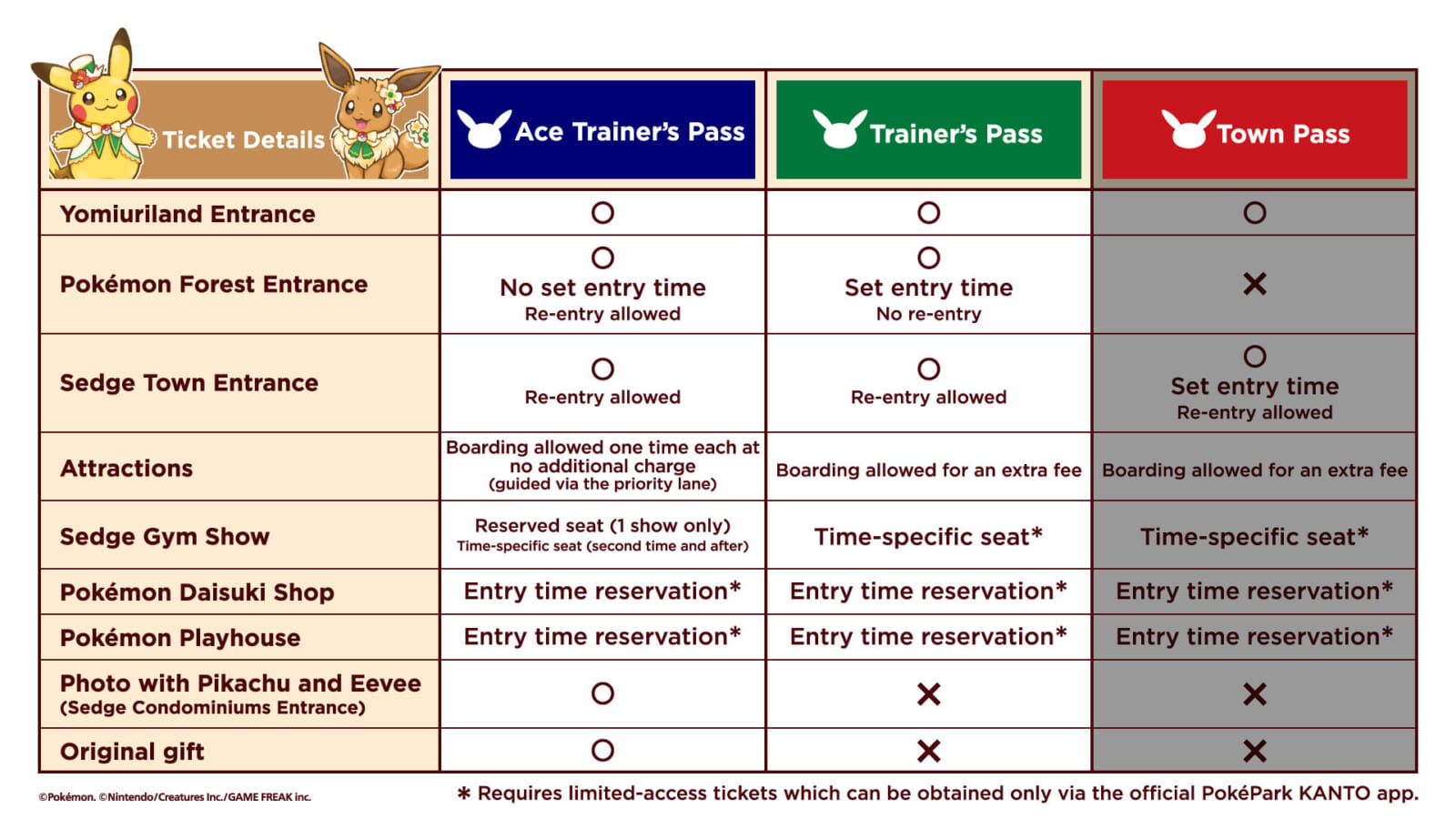The standard Trainer’s Pass (starting at ¥7900 for adults and ¥4700 for children) has a timed restriction for Pokemon forest but free access to Sedge Town.