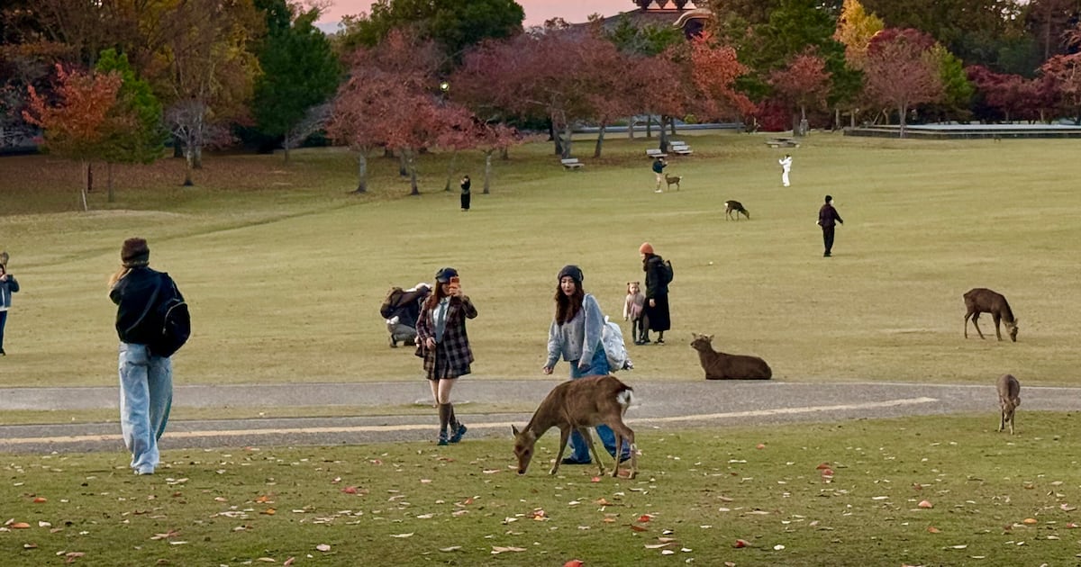 Free roaming deer in Nara Park in Nara, Japan. Nara once was the capital of Japan in the 8th century C.E. A city of extraordinary cultural significance in Japan, it is a UNESCO World Heritage Site. There are more than 1,200 deer that roam the city. Visitors can purchase special rice crackers for the deer. (Photo courtesy Sara Dykstra)