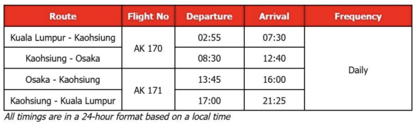 Travellers can book through-trips on AK170 between Kuala Lumpur and Osaka (round-trip AK170/AK171). They can also purchase local-sector flights between Kuala Lumpur and Kaohsiung, and also between Kaohsiung and Osaka (one-way or round-trip) under the Fifth Freedom rule.