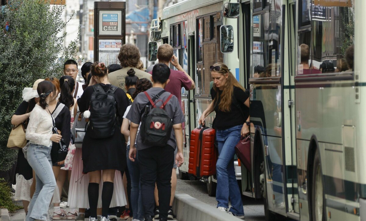 Foreign tourists wait in line at a bus stop in Kyoto, western Japan, on Oct. 15, 2025. (Kyodo)