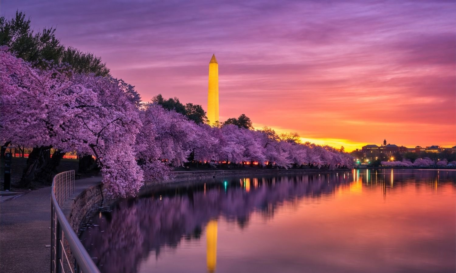 For those who want a classic, large-scale cherry blossom trip with robust visitor infrastructure, Washington, D.C. is the obvious anchor. The city’s most iconic viewing area is the Tidal Basin, where the National Park Service tracks the bloom and defines “peak bloom” as the point when about seventy percent of the Yoshino blossoms are open. It’s a major urban experience with monuments, waterfront paths, and enough museums and restaurants to keep the trip feeling full even if you miss the exact peak by a few days. Travelers who love the idea of Fujiyoshida’s famous framed view can find that same landmark alongside the energy of blossoms in D.C., but in a city designed to handle high visitor volume.