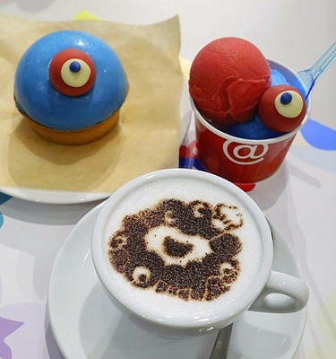 Cakes and gelatos colored red and blue like Myaku-Myaku and cappuccinos with the mascot depicted in cocoa powder are being offered.