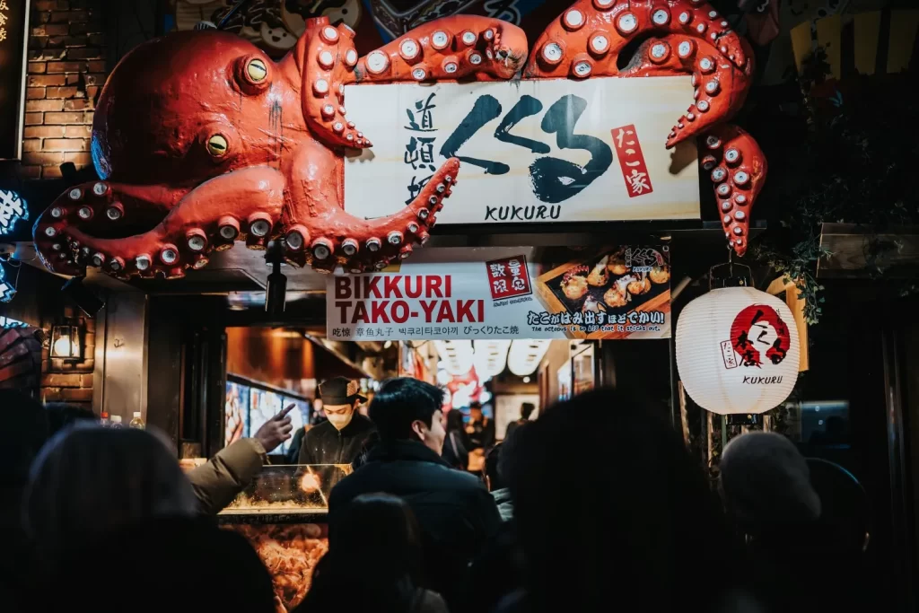 One unique aspect of this area of Osaka, and in Japan as a whole, is that a lot of the storefronts here have massive objects on the outside of their shops that depict what they are selling. Giant octopuses, gyoza, takoyaki, and crabs.