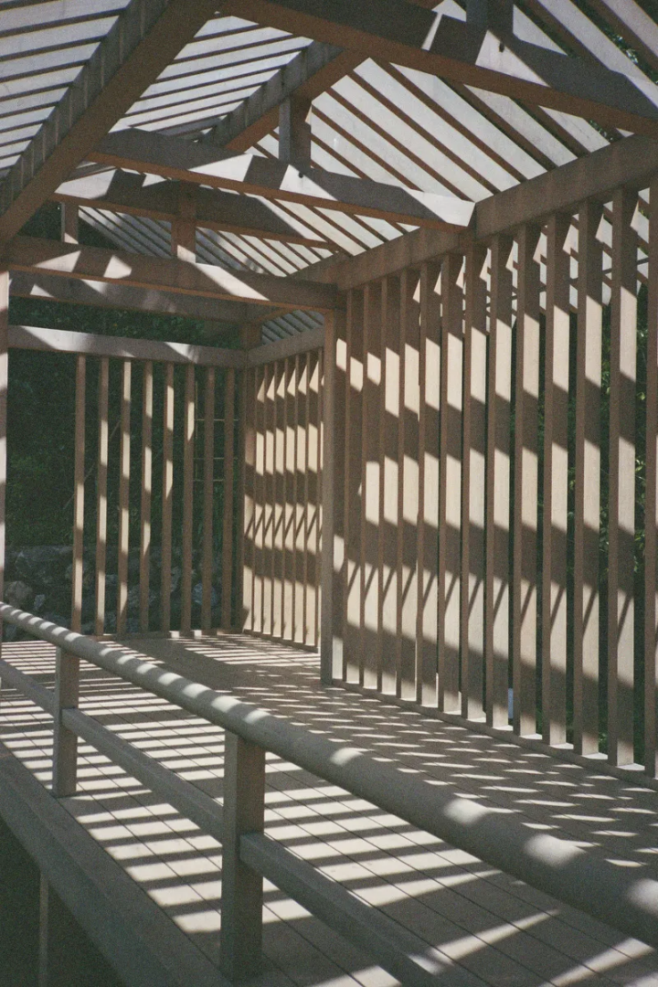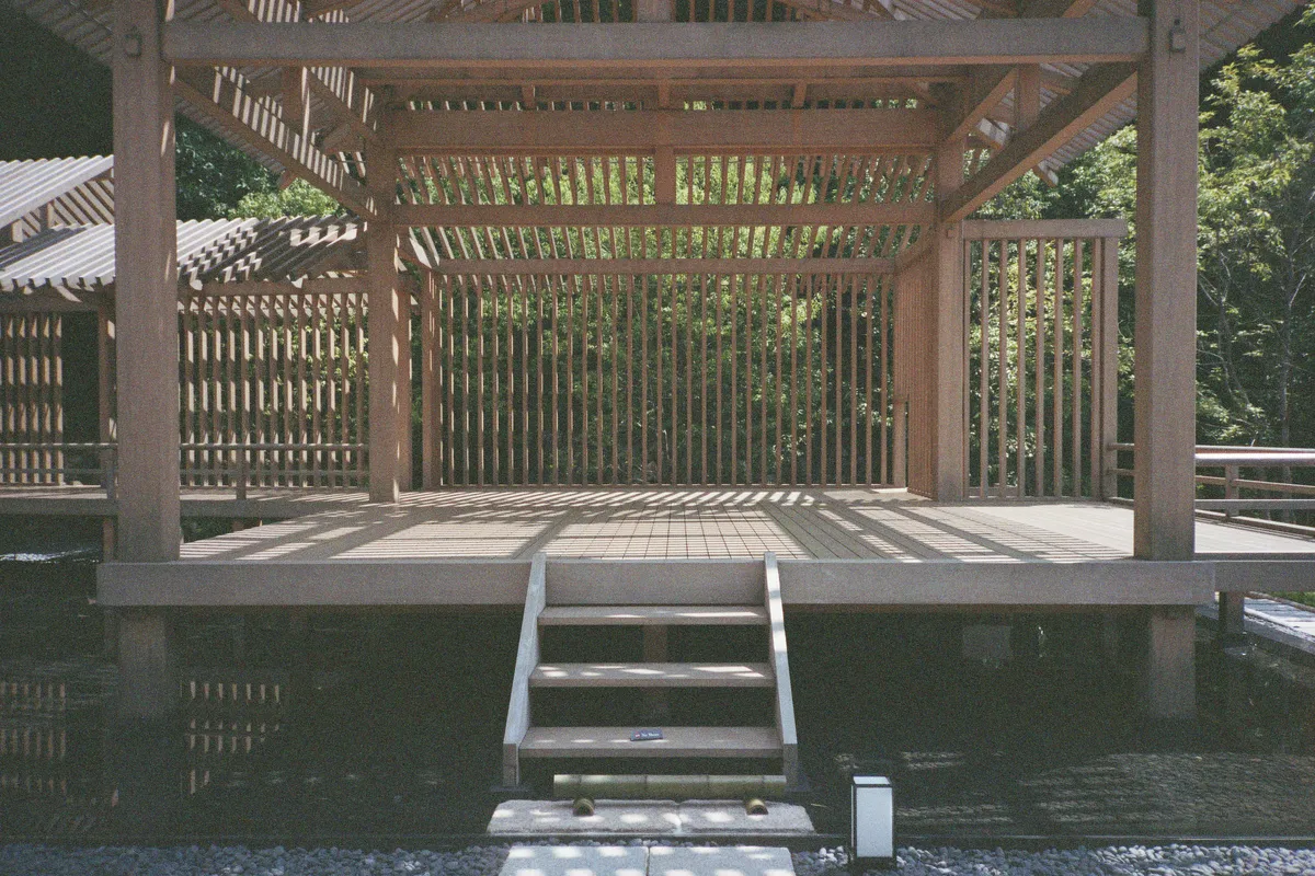 Perhaps the most striking element of Kuma’s design is the Bamboo Pavilion, a full-scale Noh stage that stands as the only such structure within a Kyoto hotel. The open wooden frame, constructed with meticulous attention to the proportions of classical Noh stages, appears almost transparent against the bamboo forest that surrounds it. Using vertical slats that echo both the bamboo stems and traditional Japanese architectural screens, Kuma created a structure that seems to dematerialize before your eyes—present yet ephemeral, solid yet somehow ghostly.
