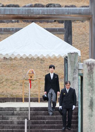 Dressed in a morning coat and carrying a top hat, Prince Hisahito proceeded slowly before the mausoleum of Emperor Meiji in Fushimi Ward shortly after 2 p.m. He offered a “tamagushi” sacred tree branch and bowed.