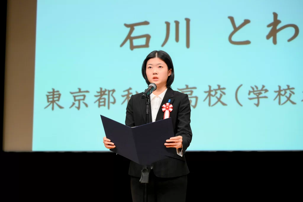 Senior High School student Towako Ishikawa presents her Grand Prize-winning essay to the audience on December 13. (©Prime Minister’s Office)