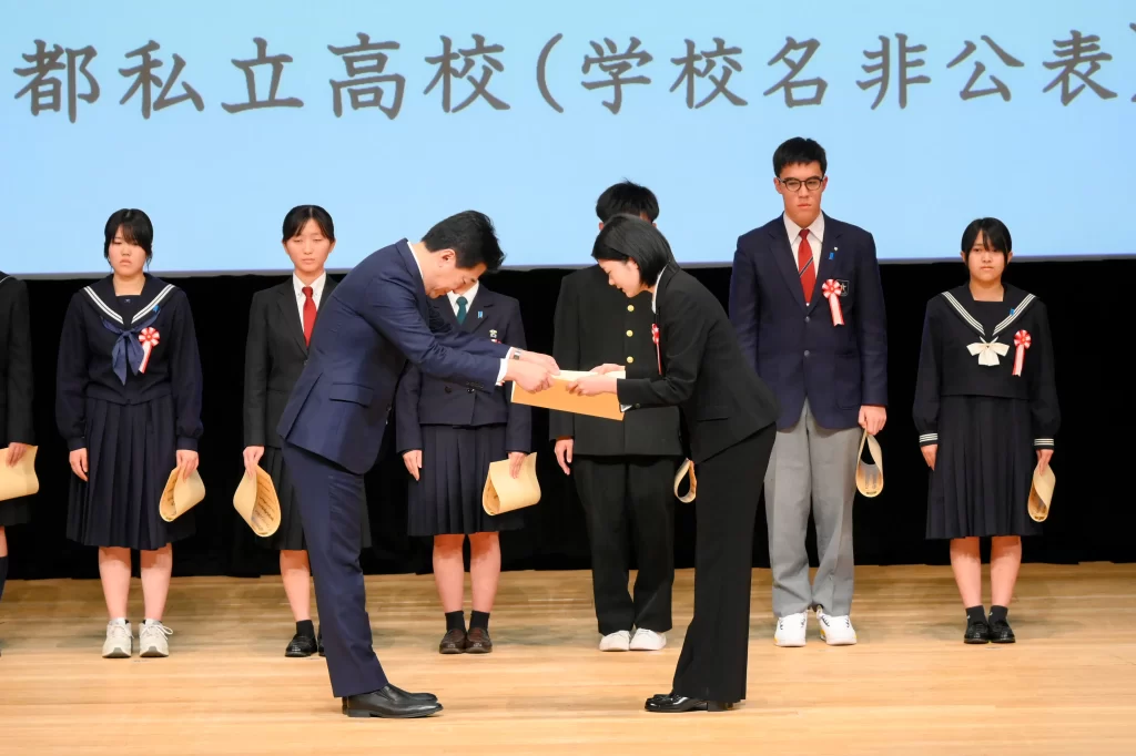 Chief Cabinet Secretary and Minister for the Abductions, Minoru Kihara, presents Towako Ishikawa with the Senior High School Grand Prize for an English Essay during 2025 North 2025 North Korean Human Rights Violations Awareness Week. December 13, 2025 (©Prime Minister’s Office)