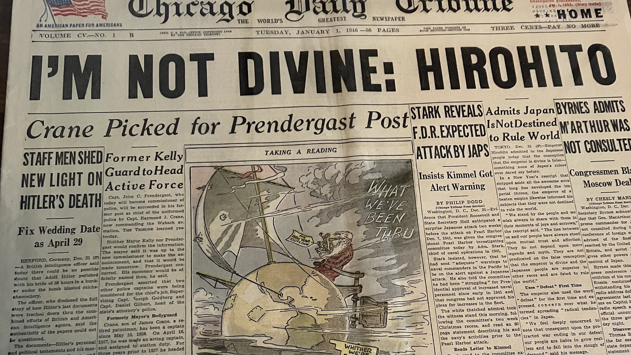 Back in the day, my parents and my in-laws saved newspapers that they recognized as having future historical significance — leaving behind an extensive collection for us to enjoy. Hats off to my wife’s parents in particular for preserving the Chicago Tribune dated January 1, 1946, with its front-page headline: “I’M NOT DIVINE: HIROHITO.”