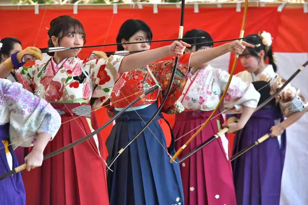 New adults participate in the National Archery Competition at Sanjusangendo Temple in Kyoto’s Higashiyama Ward on January 18. (©Sankei by Ginga Onoda)