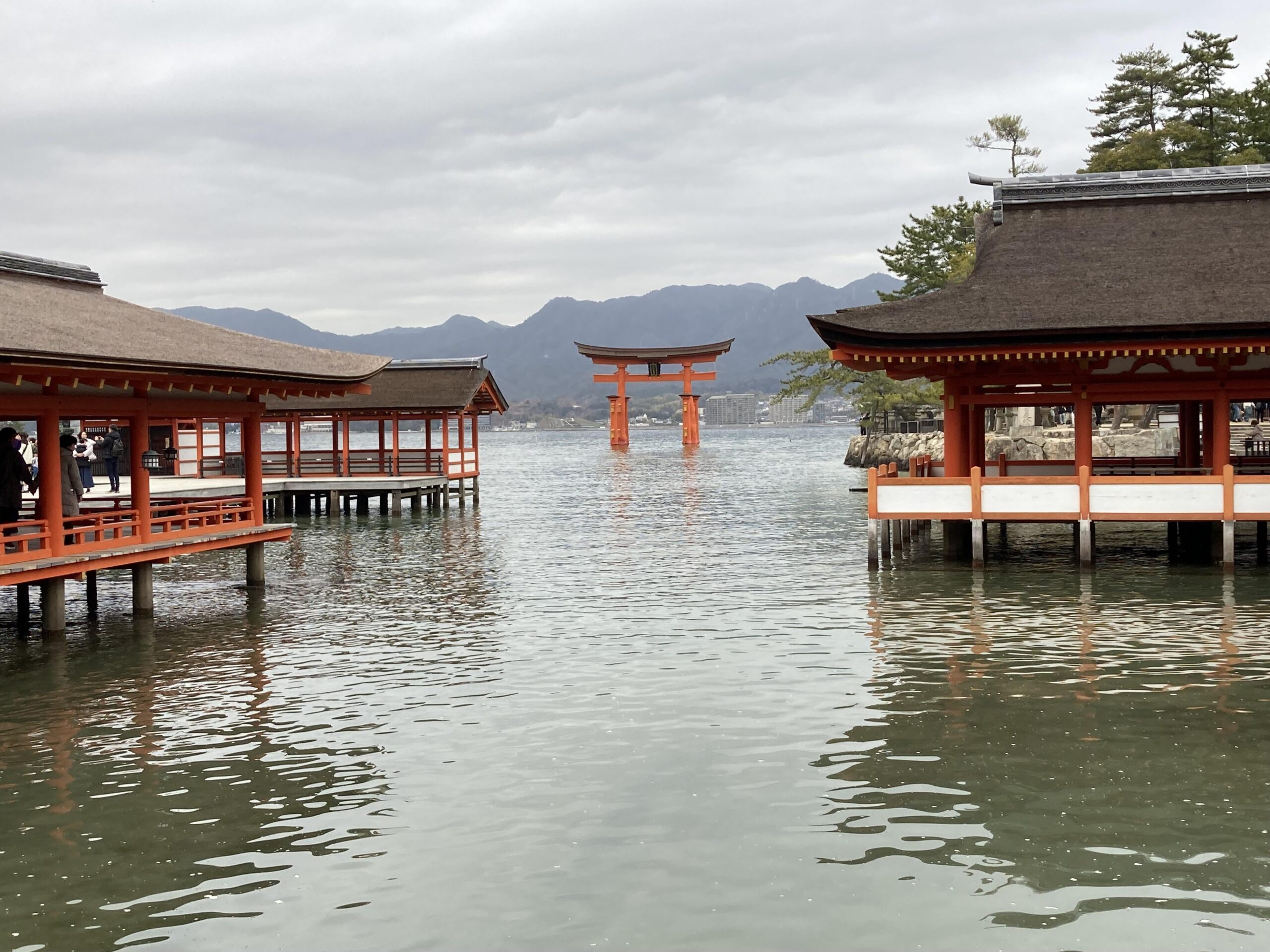 I took this photo from Itsukushima Shrine on a cloudy day, and I liked how the famous torii gate appears quietly between the buildings rather than dominating the whole frame. The weather muted the colors of the sea and mountains, which made the vermilion shrine structures stand out even more. For me, that contrast is part of what makes Miyajima so memorable — it feels both grand and calm at the same time.