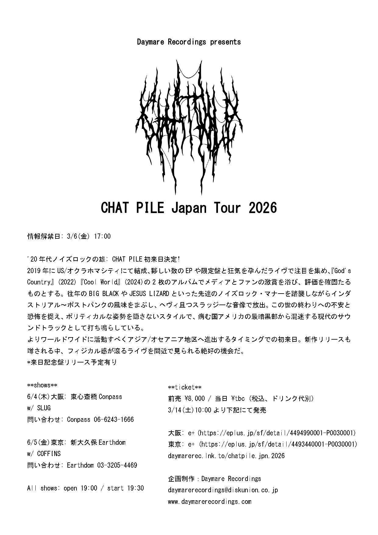 Chat Rats of the world unite! Or, at least Chat Rats of Japan and Europe/the UK. Acclaimed Oklahoma City no wave/sludge band Chat Pile just announced two shows in Japan scheduled for June. Both shows will feature support from Japanese death/doom metal outfit Coffins.