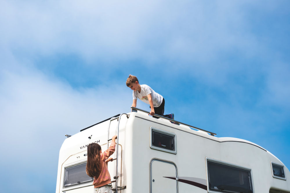 Children playing on top of their home for a two-week roadtrip across Hokkaido.
