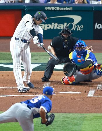 In the game at LoanDepot Park in Miami, designated hitter Shohei Ohtani of the Los Angeles Dodgers hit a solo home run in the bottom of the first inning to help Japan catch up with Venezuela 1-1.