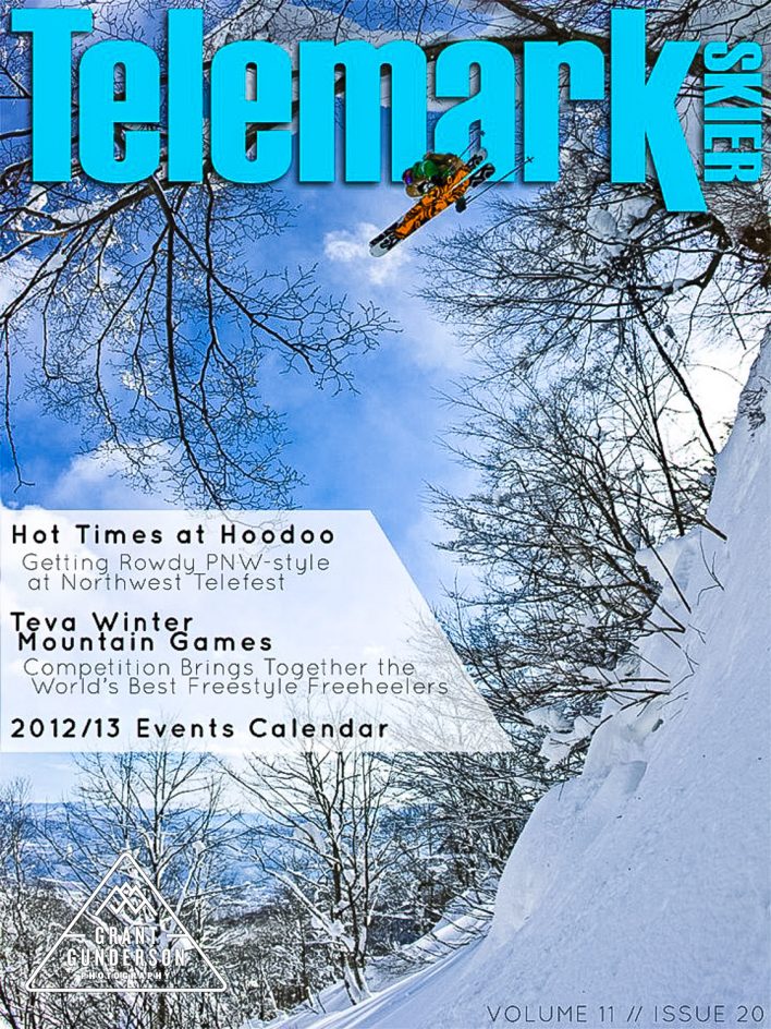 Ü takes flight on his first trip to Myoko and lands on the cover of Telemark Magazine. Grant Gunderson