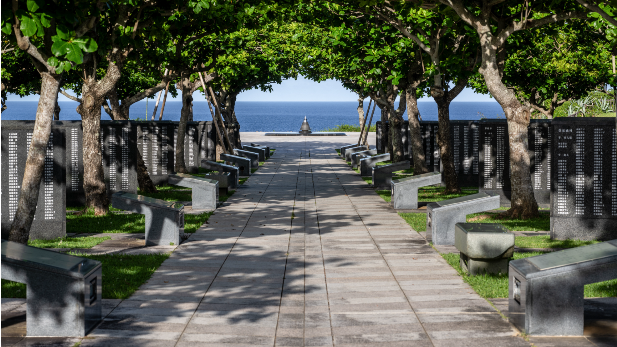 This photo taken on June 8, 2025 shows the Flame of Peace (background center) seen past trees and slabs (left and right) bearing inscribed names of the dead at the Cornerstone of Peace, a memorial commemorating the Battle of Okinawa during World War II, in Itoman city, Okinawa Prefecture. (PHOTO / AFP)