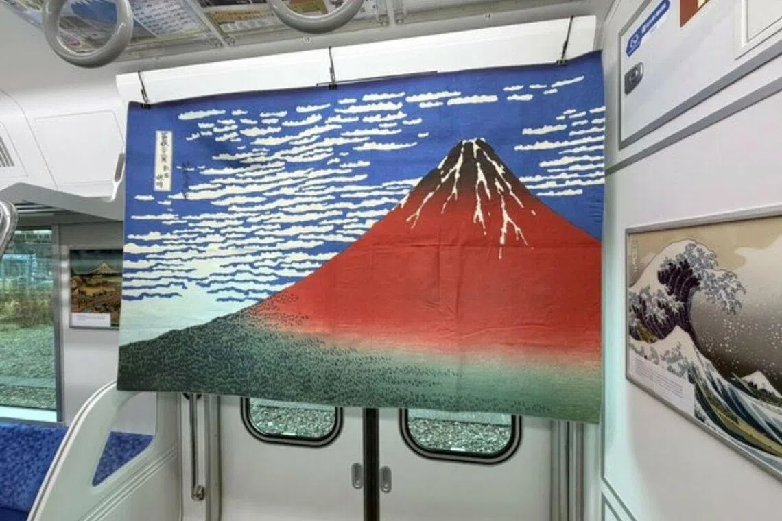 The interior of the train is decorated with images related to the Thirty-Six Views Of Mount Fuji by artist Katsushika Hokusai (1760-1849).