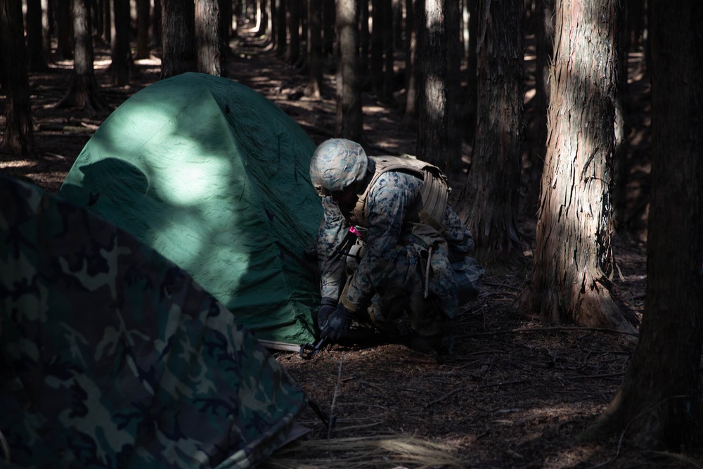 U.S. Marine Corps Cpl. Maylin Martinez, Motor Vehicle Operator with Marine Wing Support Squadron (MWSS) 171, Marine Aircraft Group 12, 1st Marine Aircraft Wing, sets up tent at Combined Arms Training Center, Camp Fuji, Japan, Jan. 28, 2026. MWSS-171 training consisted of company level field exercises with rifle and machine gun ranges, day and night convoy operations, and general fieldcraft training to maintain mission readiness. Martinez is a native of Fort Worth, Texas (U.S. Marine Corps photo by Lance Cpl. Maikeyla Reyes)