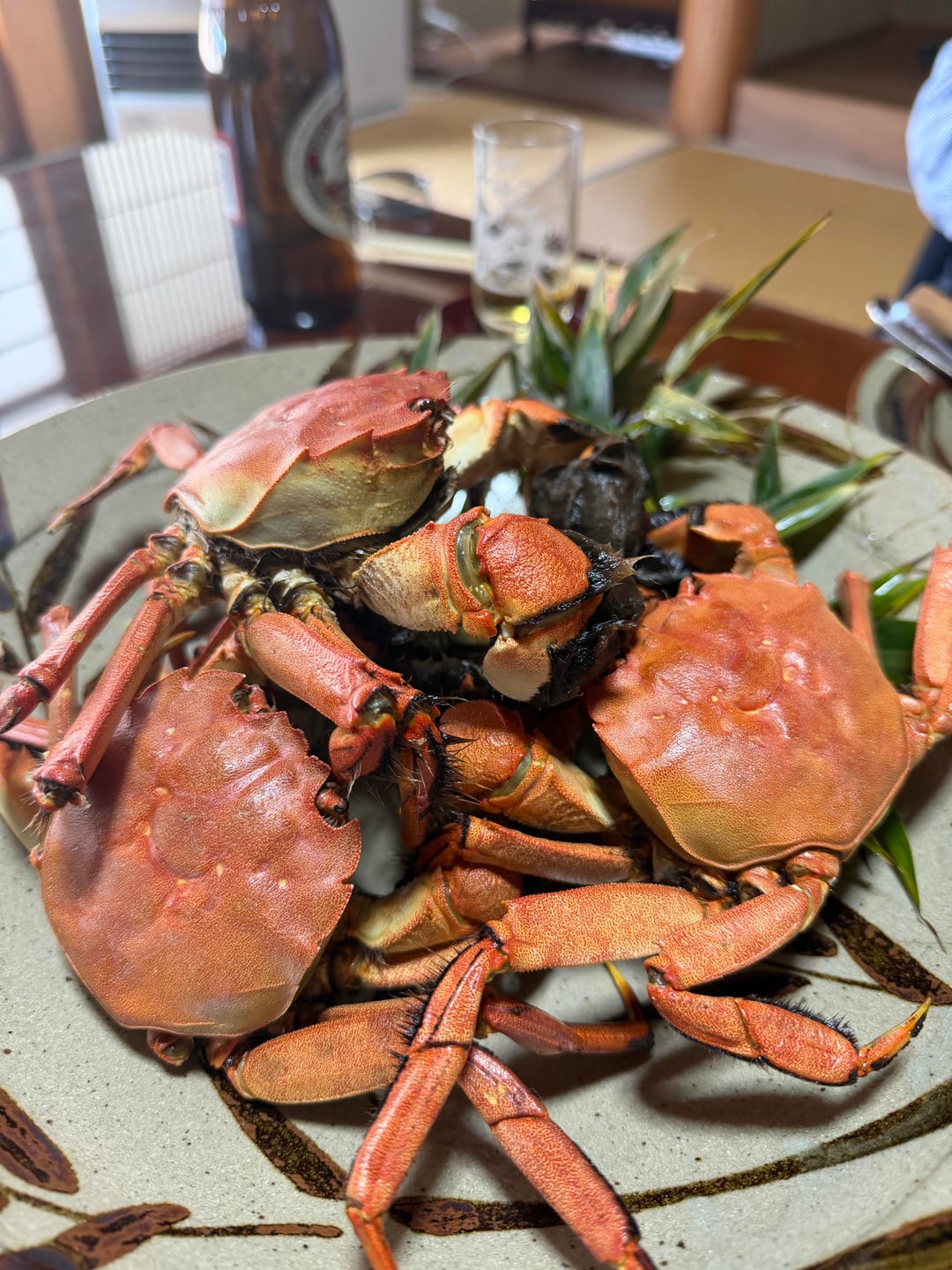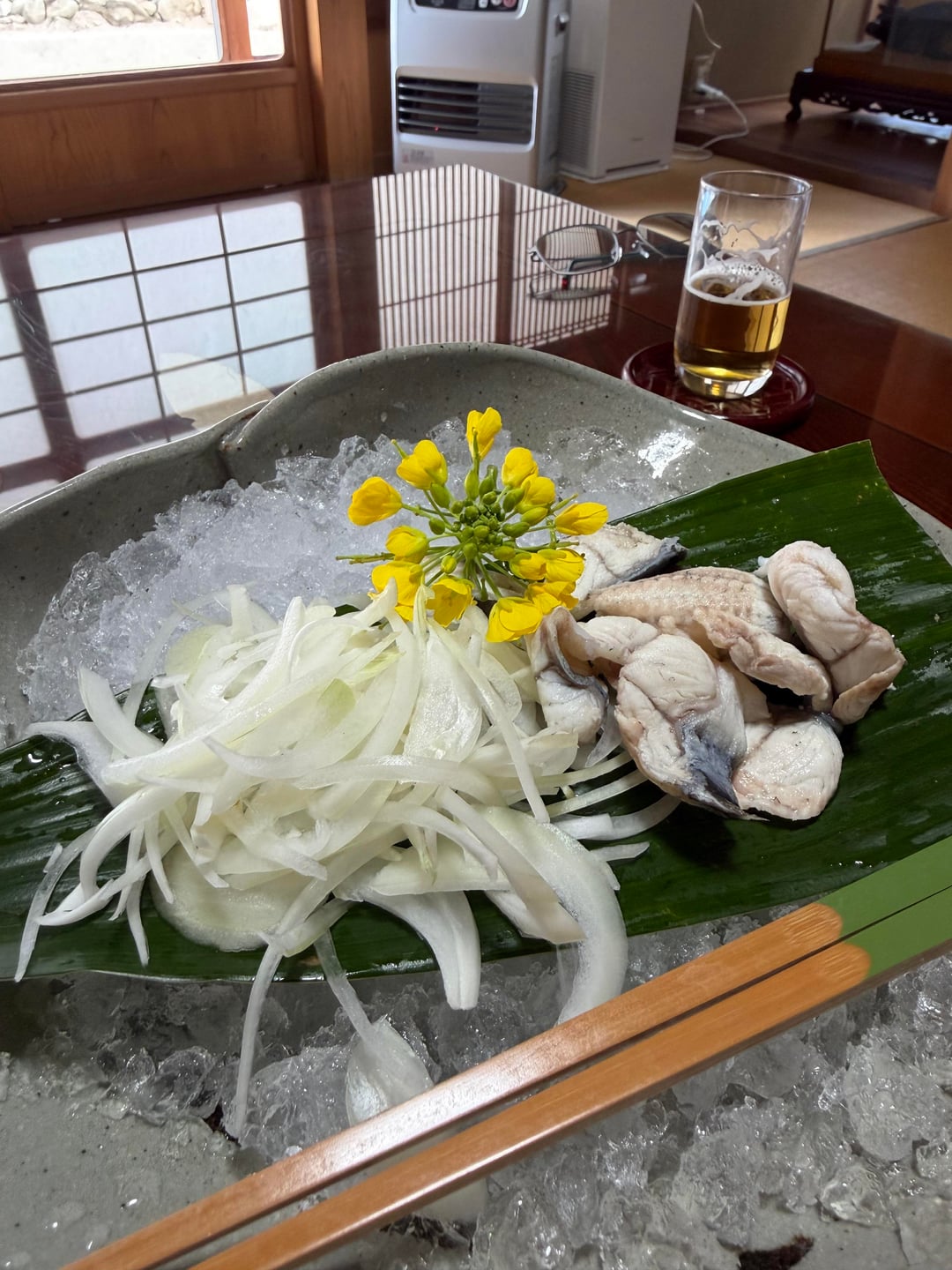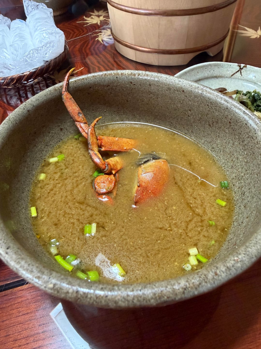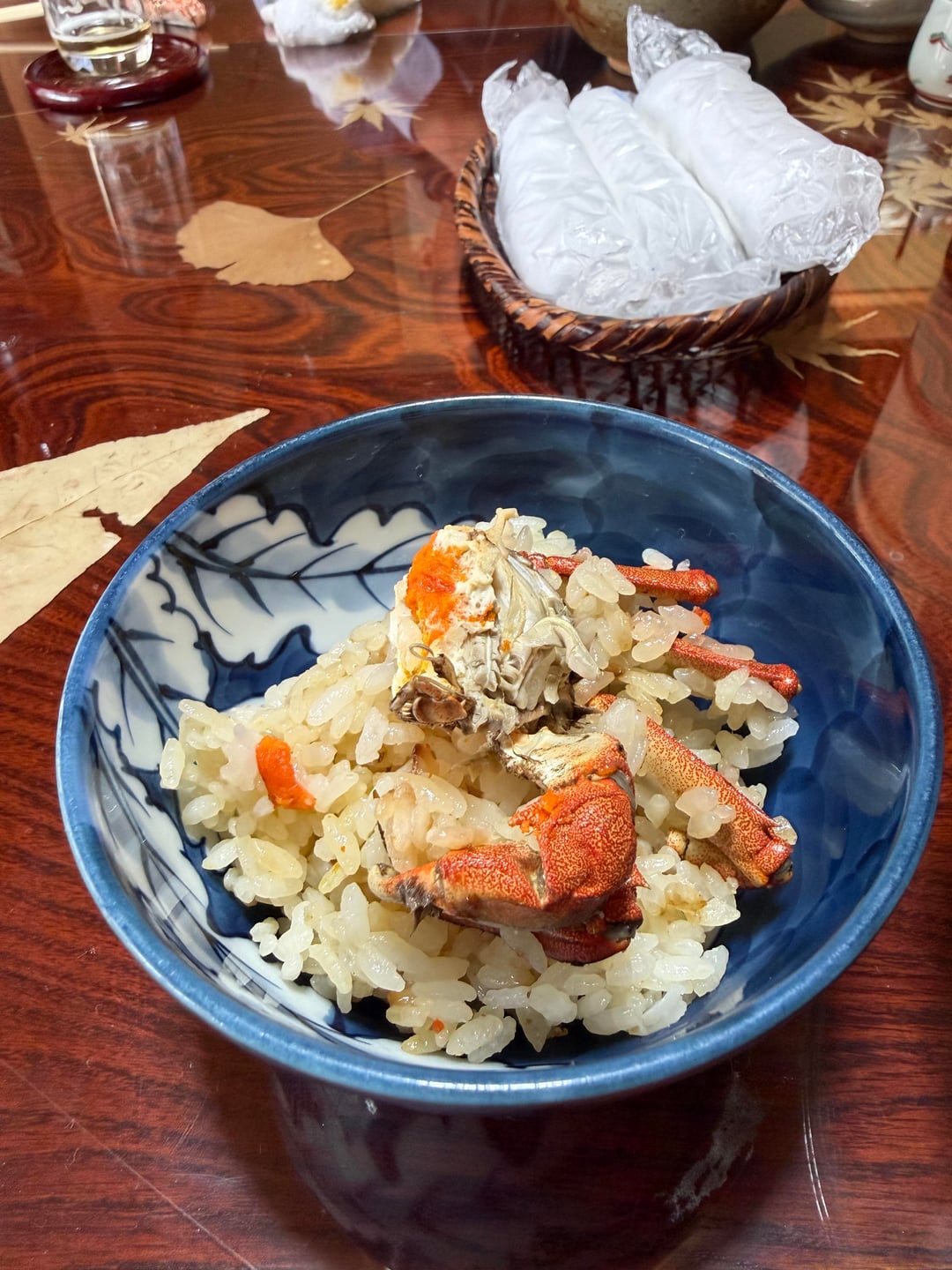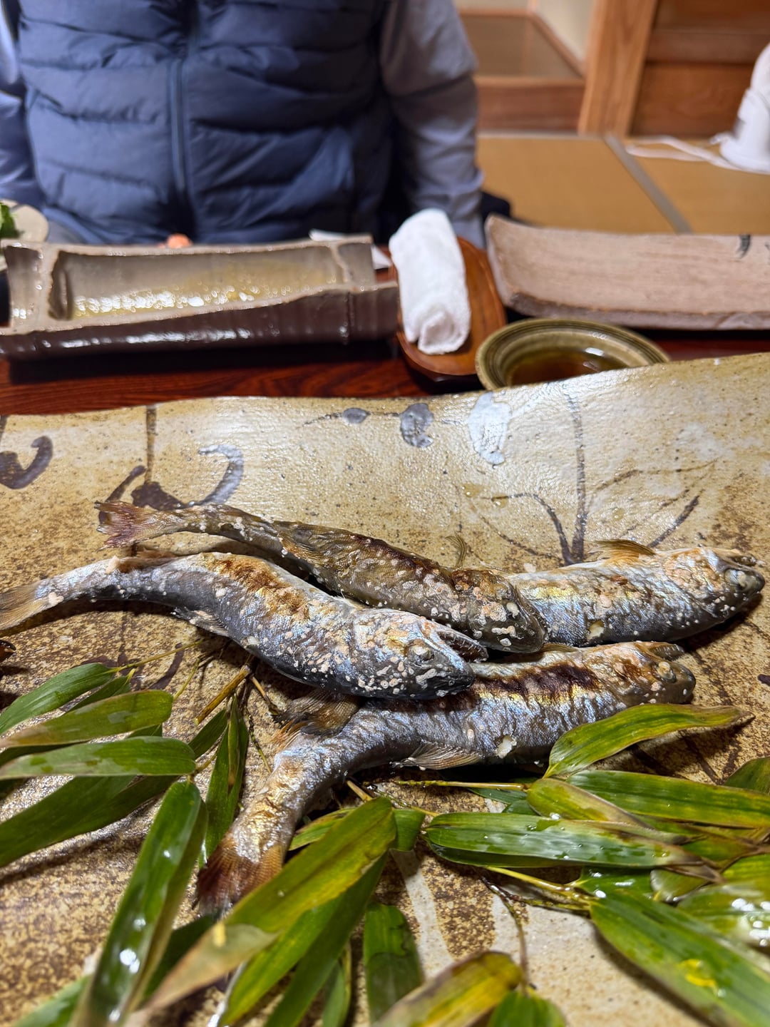 Simmered tsugani crab was eaten for its roe and tastes similar to Shanghai mitten crabs and also served in rice. Sliced carp sashimi with wild vegetables. Very clean tasting and the vegetables had sharp, acidic and sour flavor which is quite unique in Japan. The grilled sweet fish was also quite good.