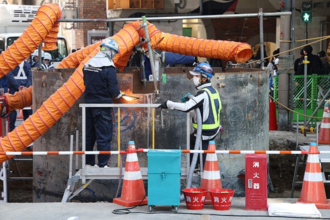 Workers begin cutting a steel pipe protruding from the ground near JR Osaka Station in Osaka’s Kita Ward on March 24. (Shinnosuke Ito)