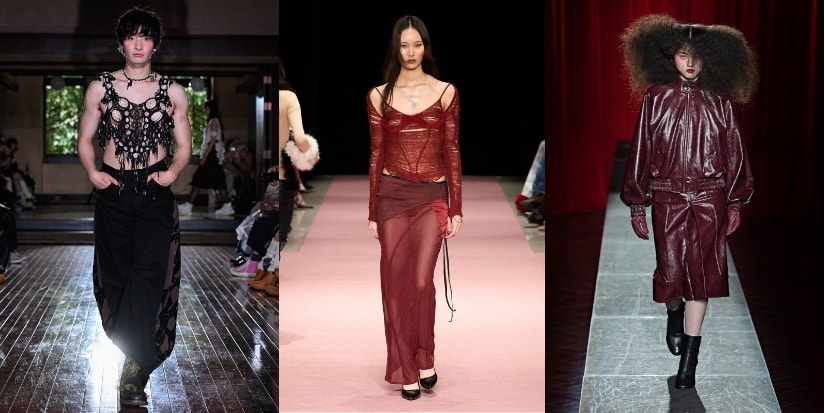Torn knits, lace panels, and spliced fabrics kept things raw and a little rough around the edges, while the palette stayed tight and moody, heavy on inky black, oxblood, and deep red, with flashes of shine from slick leather and sharp accessories. It had that effortless It Girl, crazy sexy cool energy. We could easily see Emily Ratajkowski or Julia Fox on a coffee run in one of those shredded, midriff-baring looks, tapping into a kind of Brat-era attitude without trying too hard. Someone get Addison Rae on the phone, because these are stage-ready looks that demand a spotlight.