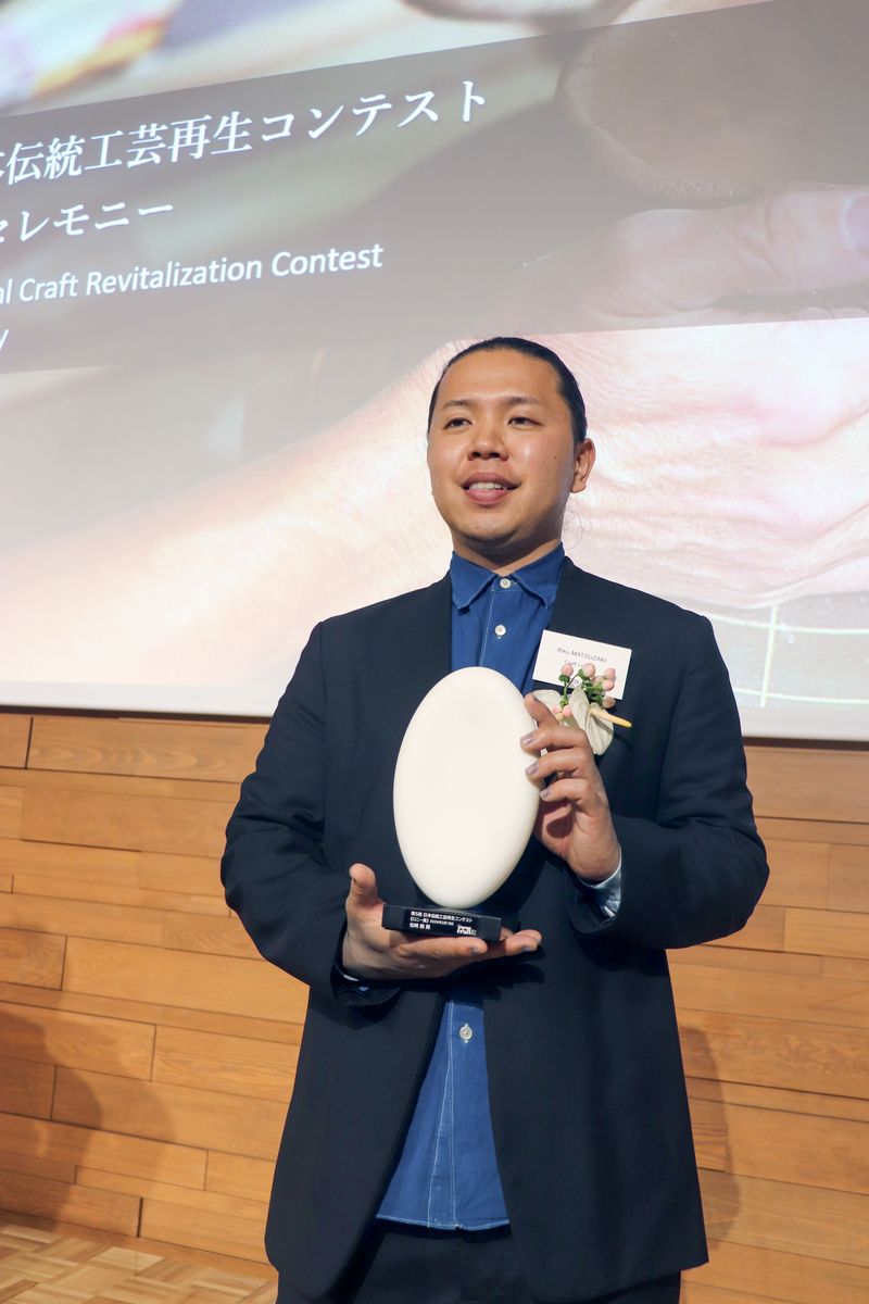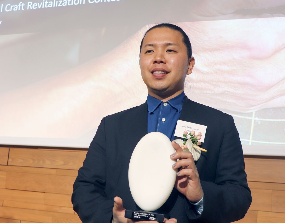Indigo dyeing artisan Riku Matsuzaki smiles while holding his plaque for winning the top prize in the fifth Japanese Traditional Crafts Revitalization Contest, at the awards ceremony in Minato Ward, Tokyo, in late February.