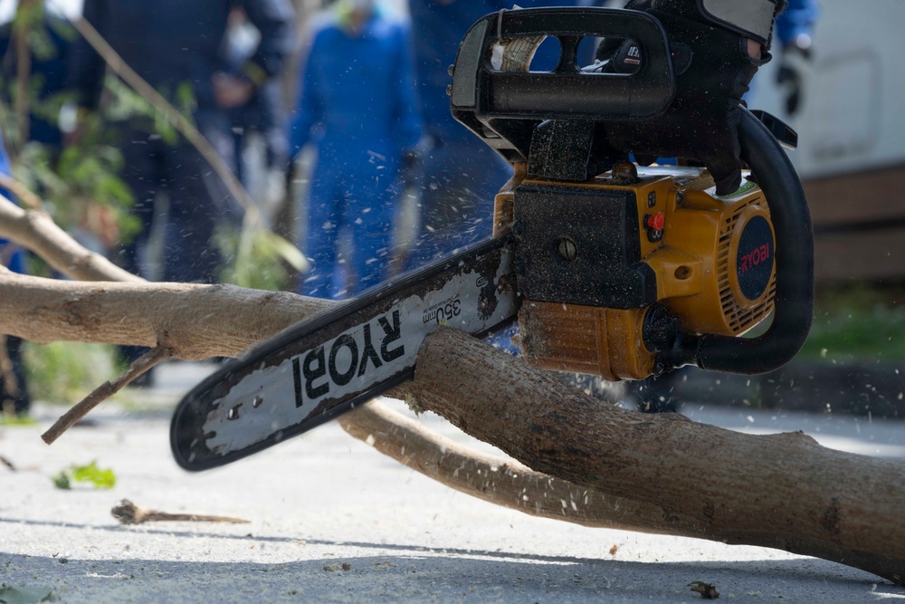 A Japan Maritime Self-Defense Force (JMSDF) Sailor cuts a tree during Jungle Attack onboard White Beach Naval Facility, March 9, 2026. Jungle Attack is an annual collaborative effort between the U.S. Navy and JMSDF to clear dense jungle at White Beach Naval Facility, ensuring local Okinawan families can access the many ancestral tombs located on base during Shimi – a traditional observance in April when families clean and visit gravesites to honor their ancestors. CFAO maintains and operates facilities to support United Nations Command-Rear missions, coalition and allied partners, U.S. Navy ships, submarines, and aircraft, and Joint force assets in the Indo-Pacific region. (U.S. Navy photo by Mass Communication Specialist 2nd Class Zack Guth)