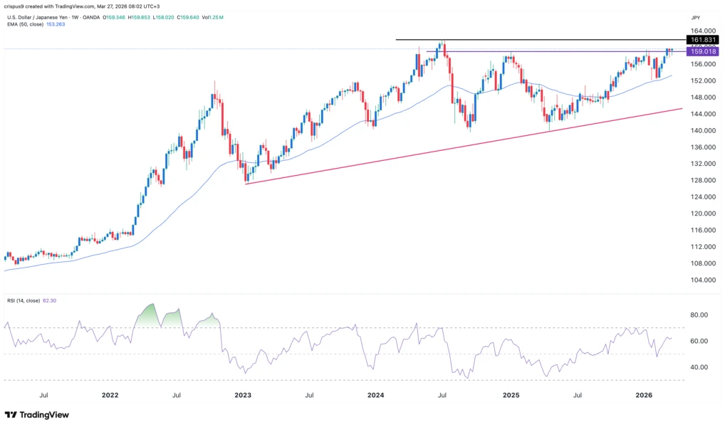 The Japanese yen continued its downtrend this week, raising the possibility that the Bank of Japan (BoJ) will intervene as it nears a crucial level. The USDJPY exchange rate was trading at 159.60, a few points below the all-time high of 161.95. It has soared by over 14.3% from its lowest point last year.