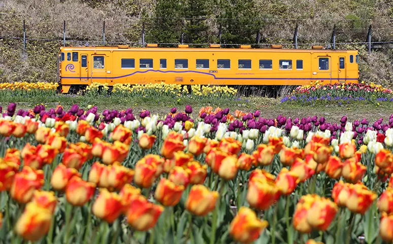 The South Hokkaido Railway and the tulips of Saraki Cape.