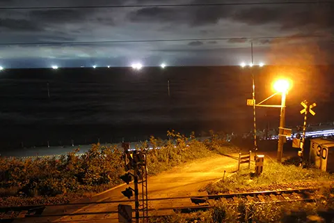 The lights visible on the sea in the background are isaribi, or ‘fishing lights,’ from which the railway takes its name.