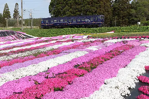 The Nagamare train running along the Satsukari Murakami Moss Phlox Garden, where moss phlox blooms in a vibrant carpet.