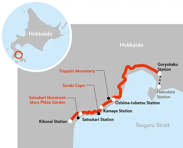 Notable spring flower spots along the line include the Yae-zakura (double-flowered cherry blossom) trees at Trappist Monastery near Oshima-tobetsu Station, the Shiba-zakura (moss phlox) at the Satsukari Murakami Moss Phlox Garden near Satsukari Station, and the tulip beds at Saraki Cape near Kamaya Station.